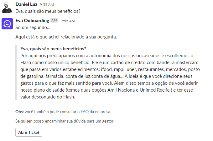 3. Bot multiplataforma: A plataforma da Eva Onboarding também possui em sua plataforma uma assistente virtual que funciona respondendo as principais dúvidas de seus colaboradores e ainda abrindo tickets, caso a dúvida não seja esclarecida.